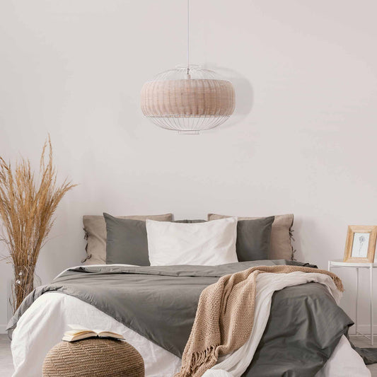Suspension VALENTINA WHITE en métal filaire et rotin avec monture électrique E27 55 cm diamètre