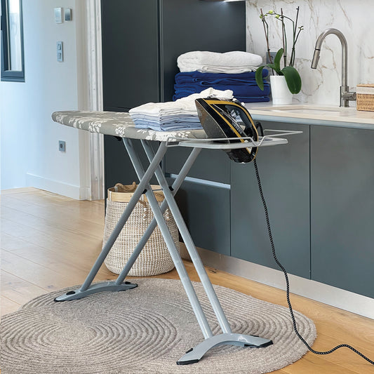 Table à repasser pliable UTAH en acier 125x41 cm avec repose fer et support centrale vapeur, housse coton, hauteur réglable, stable et pratique