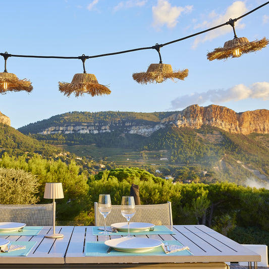 Guirlande lumineuse raccordable d'extérieur avec abat-jour en herbe marine style bohème 7 ampoules à filament douille E27 LED blanc chaud MOLLY LIGHT 6m