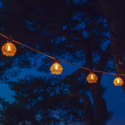 Guirlande lumineuse extérieur connectable 10 abat-jour naturels en bambou NATURA LIGHT HYBRID LED blanc chaud 8m solaire et sur secteur