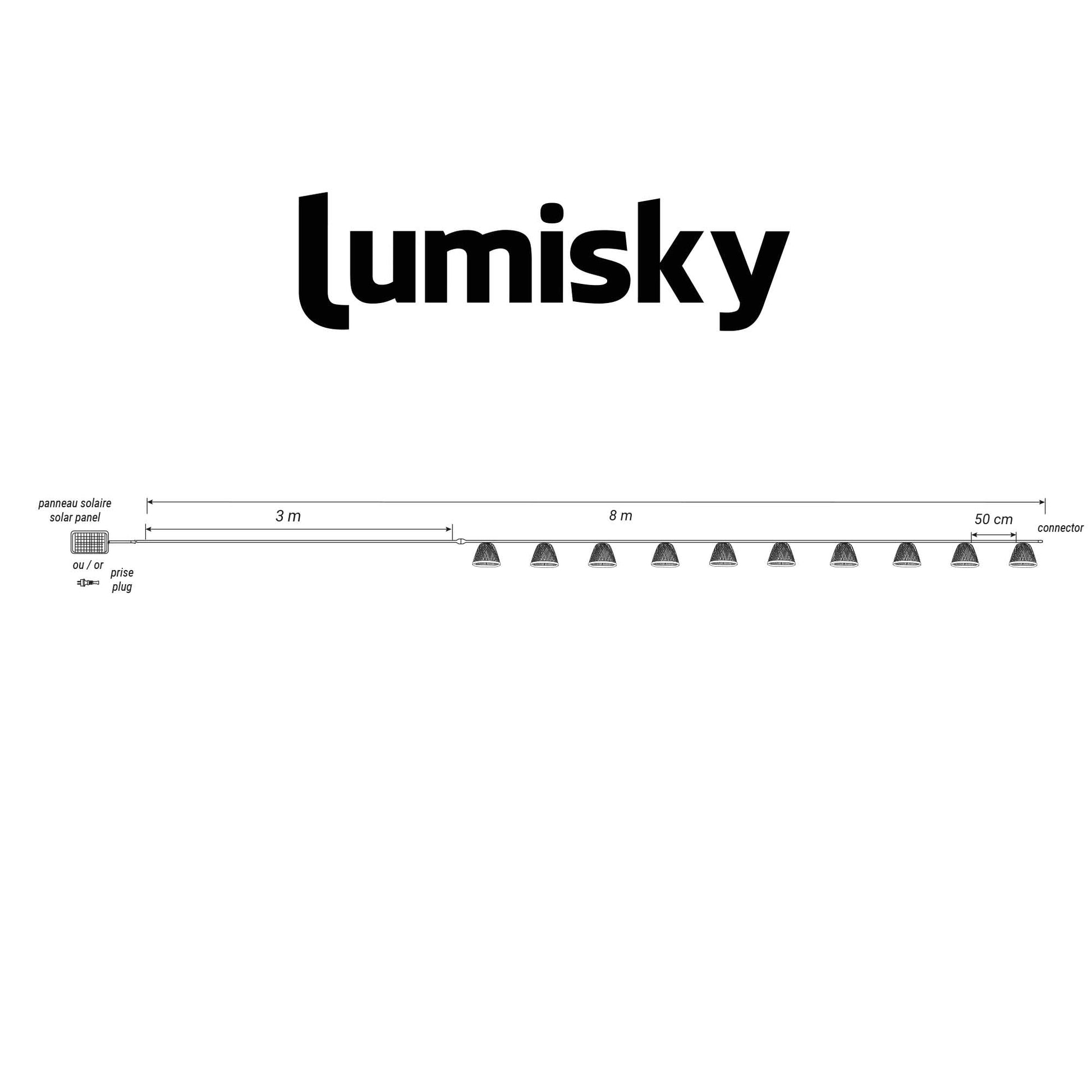 - Durabilité : La guirlande solaire Maly Light Hybrid design d’une longueur totale de 8m composée de 10 ampoules transparentes est protégée contre les éclaboussures (IP 44) et résiste aussi aux UV. Il y a 50cm entre chaque ampoule.