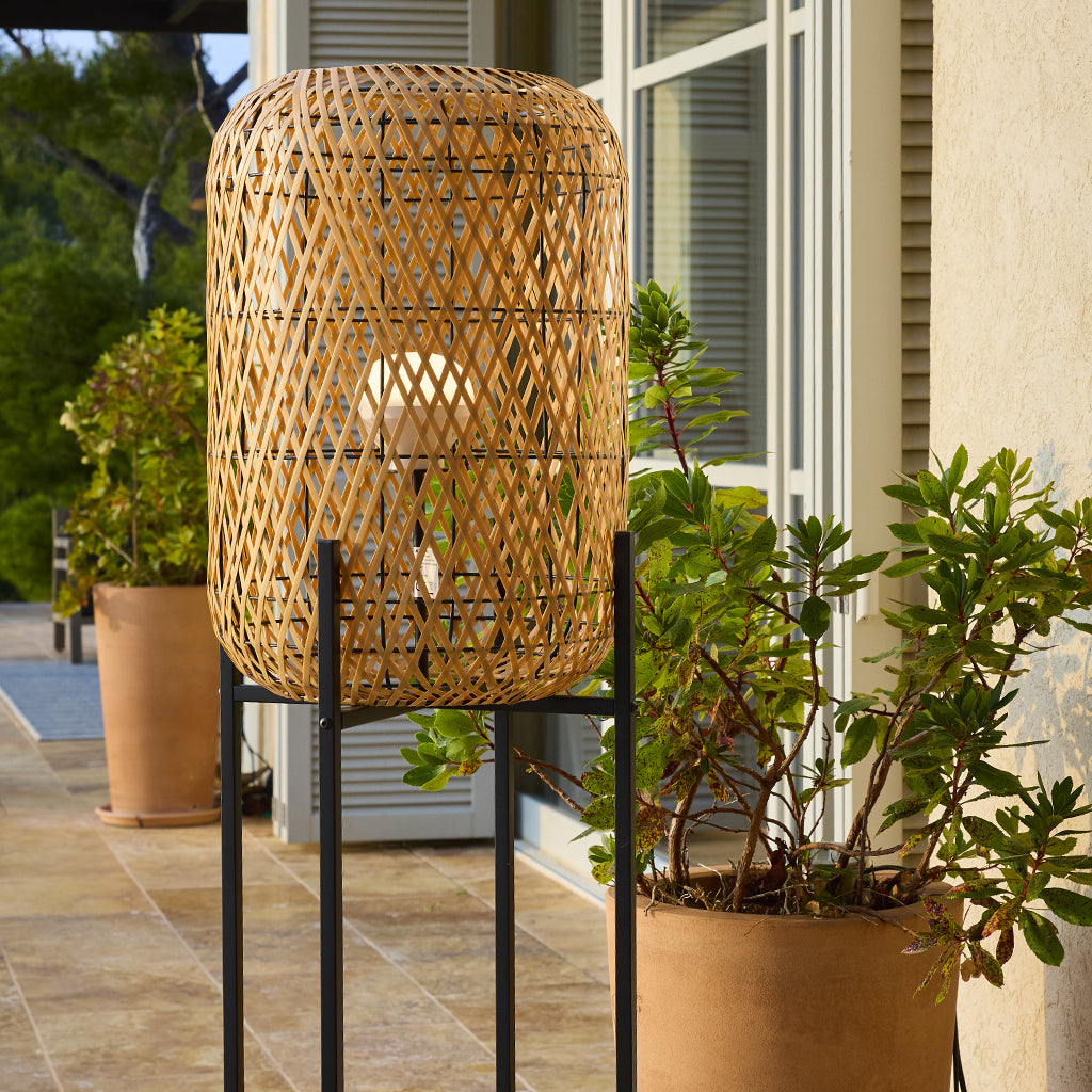 - Lampadaire LED sans fil design : abat-jour tressé effet bois en polyrotin et structure en métal noir. Équipé de l’ampoule rechargeable LYS à fixation magnétique, il diffuse une lumière blanche ou multicolore pour un rendu moderne et élégant.