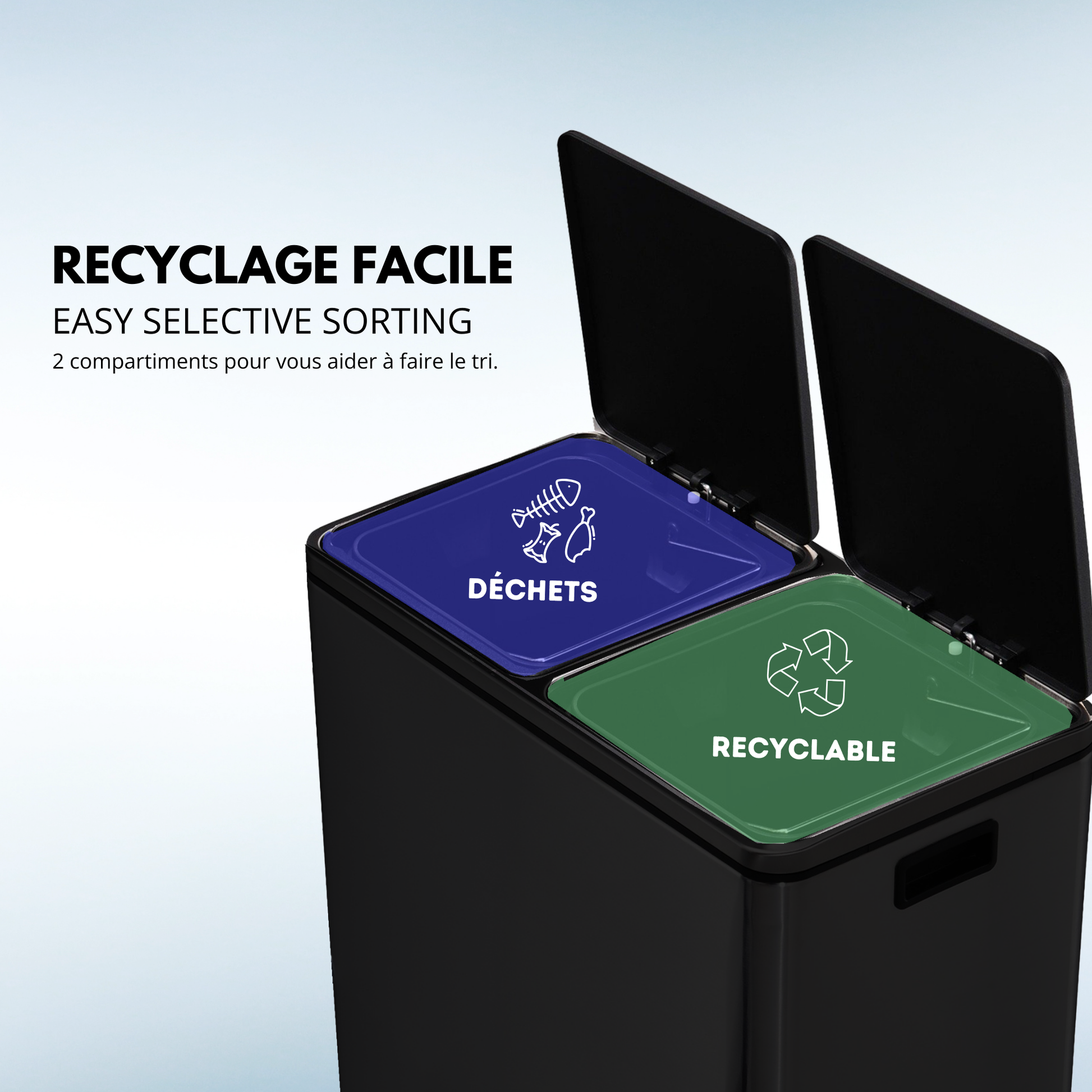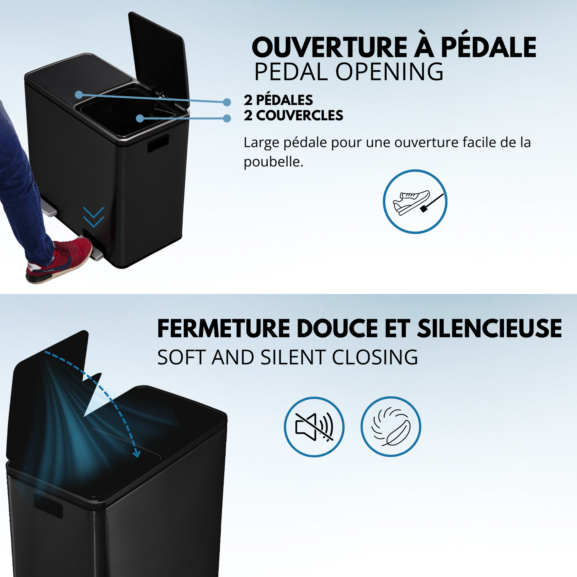 Poubelle de cuisine à pédale tri sélectif grande capacité 60L (2x30L) MAJOR en acier Inox Noir mat